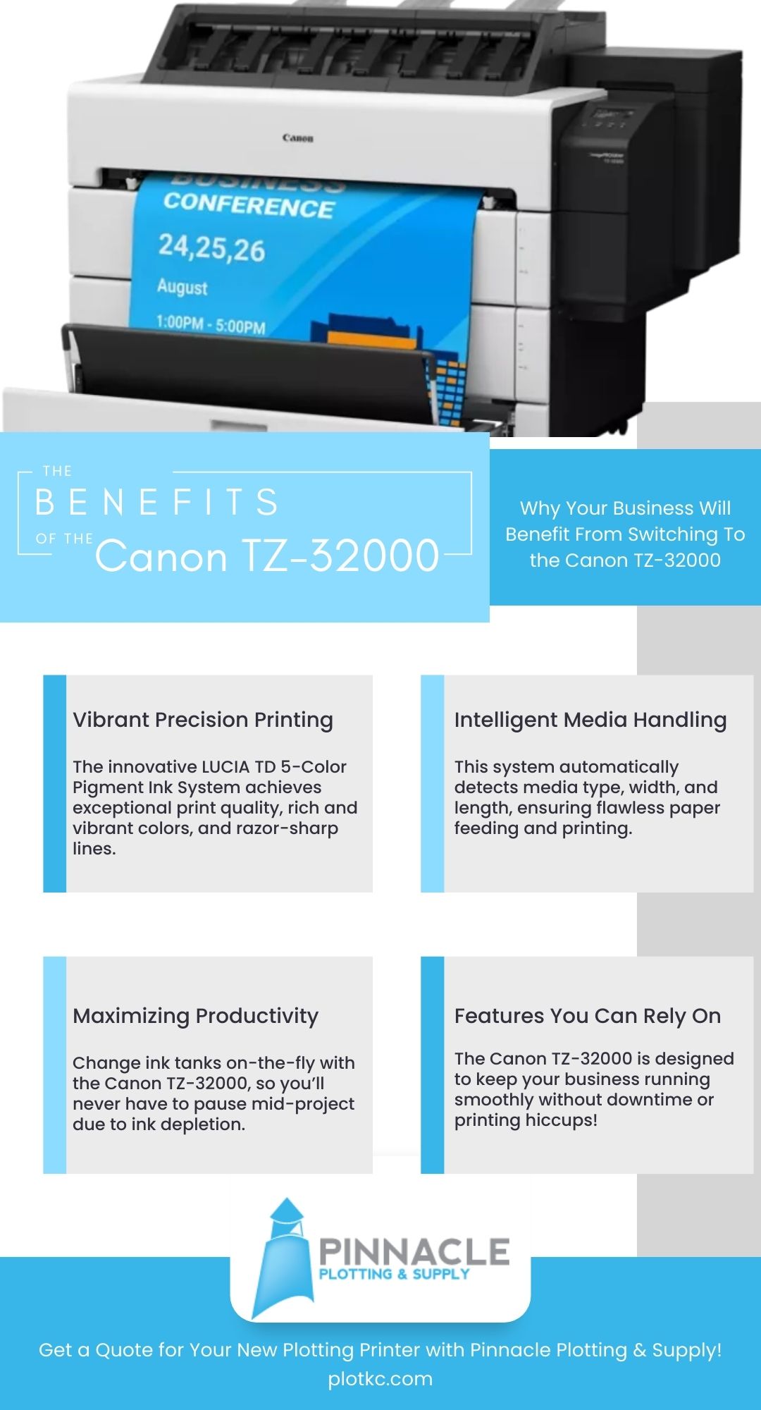 Are you ready to revolutionize your business operations? Experience the difference with the Canon TZ-32000 and explore the potential it brings. Visit Pinnacle Plotting today to learn more and make a transformative investment in your business’s future.